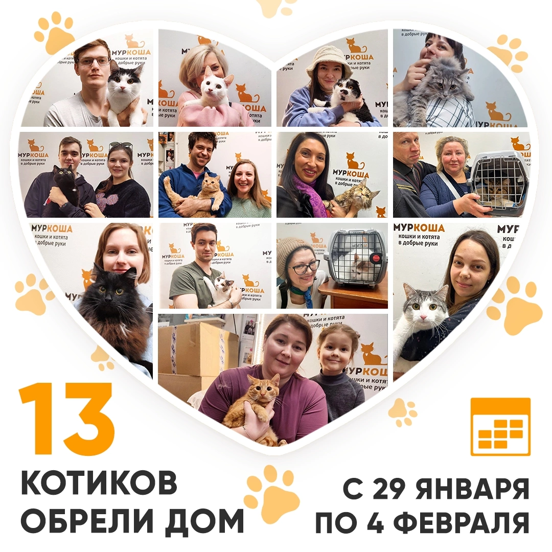 Друзья! Сегодня среда, и мы, как обычно, подводим итоги работы «Муркоши» за прошедшую неделю. Кто же стал счастливым выпускником Центра помощи кошкам «Муркоша» с 29 января по 4 февраля 2024 года? 😺 🥳 Итак, за прошедшую неделю домашними и любимыми стали 13 котиков! 1. Кот Черномур, 2.2 года Черномур в процессе аларации: «Осматривает пока что всё». ❤️ 2. Кот Каперс, 5 лет 3. Кошка Услада, 1.4 года 4. Кошка Чулюпа, 5 лет (поехала к нашим выпускникам Жестине и Муаммару 😻) Привет от Чулюпы: «Аппетит хороший, лоток найден, собаку не замечает , как будто всю жизнь с ними жила, пока проблема с принятием Жестины. Но думаю надо время». ❤️ 5. Кошка Софит, 1.4 года Софит дома. 🥰 6. Кошка Соломка, 4 года Соломка постепенно обживается дома. 🥰 7. Кот Фокстрот, 3 года (поехал к нашему выпускнику Эдуардо 😻) Первый совместный привет: Фокстрот и Эдуардо. 🥰 8. Котенок-мальчик Эфри, 6 месяцев 9. Кот Лэндон, 5 лет Лэндон в процессе адаптации. ☺️ 10. Котенок-девочка Демка, 11 месяцев Демка: первы