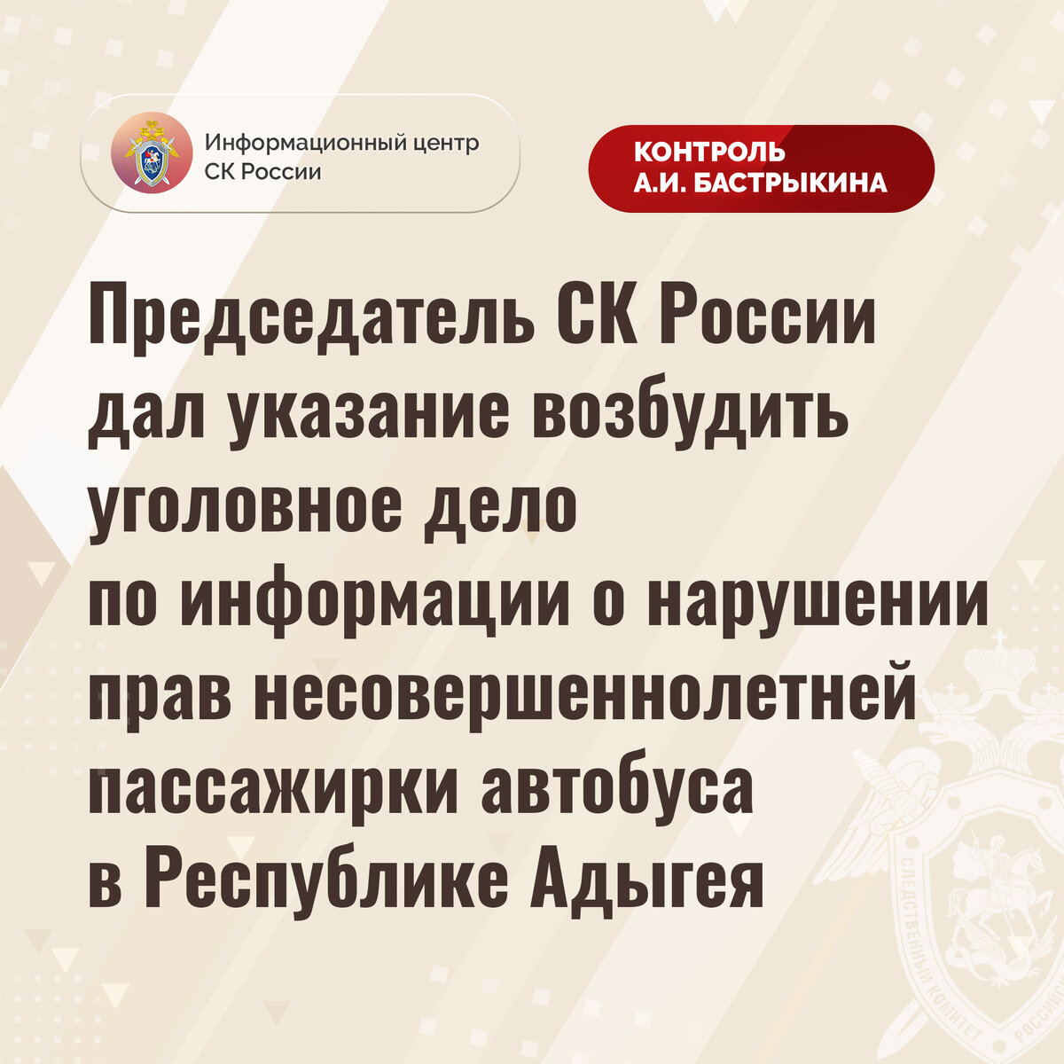 Председатель СК России дал указание возбудить уголовное дело по информации о нарушении прав несовершеннолетней пассажирки автобуса в Республике Адыгея