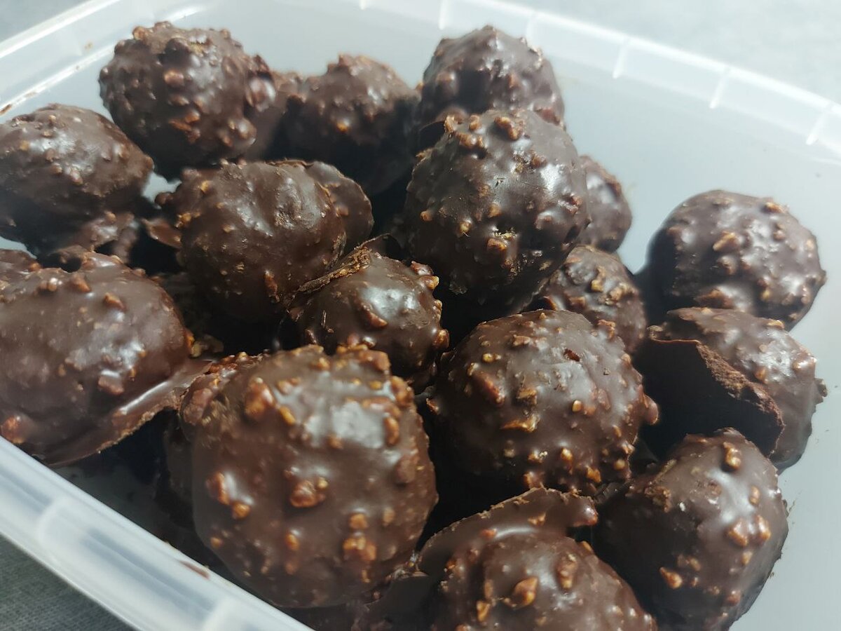 Новогодние праздники кончились, сладкие подарки тоже, поэтому опять на повестке дня вопрос по сладостям для семьи. Я в принципе не очень люблю магазинные изделия, не понятно что в них положили. Лучше потратить 20-30 минут на домашнюю выпечку, чем баловать детей вкусняшками не понятного качества. У меня есть дежурный рецепт тортика, который печется 15 минут и пропитывается 30 минут (ссылку оставлю в конце). Но за последние года он им явно поднадоел. Поэтому пришлось думать – что такого приготовить, чтобы и быстро и вкусно. Идею подала моя мама. Не буду растягивать, просто расскажу как все делается. Понадобится затяжное печенье или обрезки от коржа (с обрезками слаще получается), орехи по вкусу (делала с миндалем и кешью, первый вариант дает более выраженный вкус ореха), вафли с хорошим составом (я использовала вафельные коржи), творожный сыр (можно заменить сгущенкой, сметаной, сливками) и плитка шоколада и горсть орехов для обвалки конфет. Список продуктов закрепляю в комментариях. Все