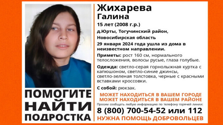 В деревне Юрты в Тогучинском районе Новосибирской области благополучно завершились поиски 15-летней Галины Жихаревой. Ее местоположение было неизвестно с 29 января 2024 года. В тот день девочка ушла из дома и не вернулась. Школьницу искали волонтеры поисково-спасательного отряда (ПСО) «ЛизаАлерт» и сотрудники полиции. Она жива, ее здоровью ничто не угрожает. «Найдена, жива! Спасибо всем, кто распространял информацию в сети и делал репосты», - кратко написали волонтеры отряда «ЛизаАлерт» в своей официальной группе в социальной сети «ВКонтакте», не уточнив, где все это время была юная сибирячка. Ранее «Вести Новосибирск» рассказывали, что в Бердске без вести пропала 14-летняя девочка с косоглазием. С 17 января 2024 года ее местонахождение неизвестно. Если у вас есть информация о местонахождении подростка, сообщите об этом по телефону ПСО 8-800-700-54-52 или наберите 112.