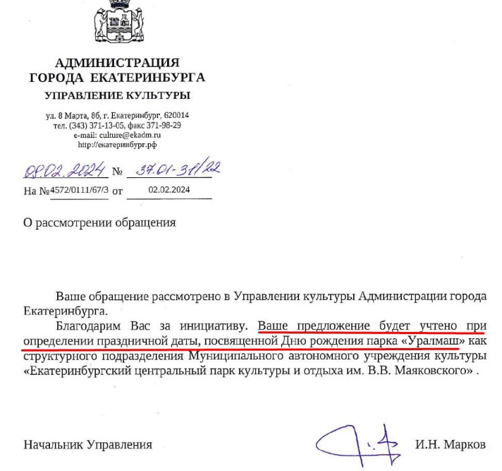 По словам депутата ЕГД, в День России, когда в парк привезли группу «На-На», площадку посетили десятки тысяч людей. «Как руководитель фракции «Единая Россия» в гордуме предложил объявить постановлением день 12 июня — официальным Днем парка Уралмаш. Будет очень символично, празднично и красиво. День России - День парка! Алексей Валерьевич меня поддержал, 12 июня поистине новый День рождения парка «Уралмаш»!», - поделился руководитель фракции «Единой России» в гордуме Екатеринбурга Алексей Вихарев. В администрацию было выслано обращение рассмотреть другие знаменательные даты в Орджоникидзевском районе для празднования праздника . Ответ на первое обращение (февраль 2024) 26.03.2024 года на заседании ЕГД Илья Марков не смог публично отказать депутату Вихареву А. и ответил: https://youtu.be/EnaK1H