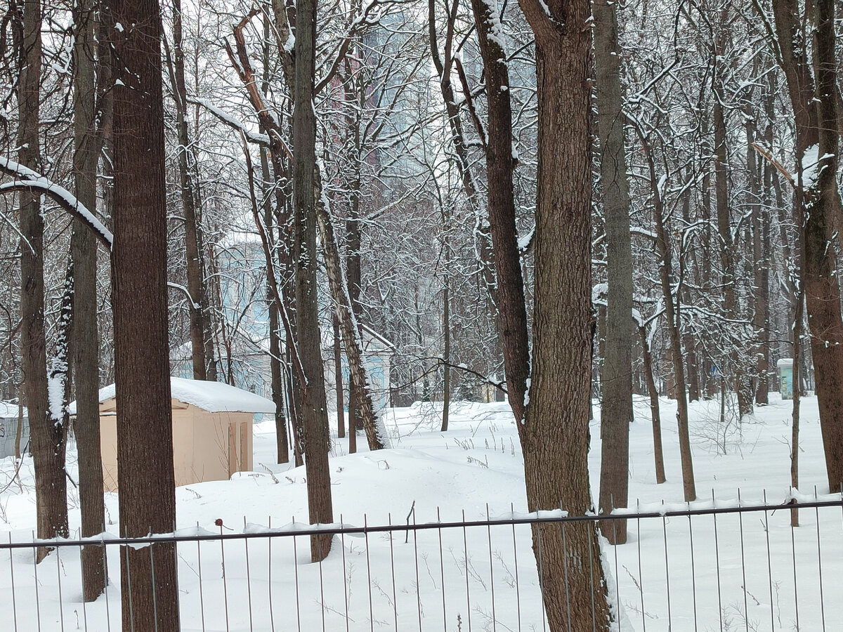 С трудом угадываются за деревьями в январском мареве очертания церкви иконы Божией Матери "Знамение".