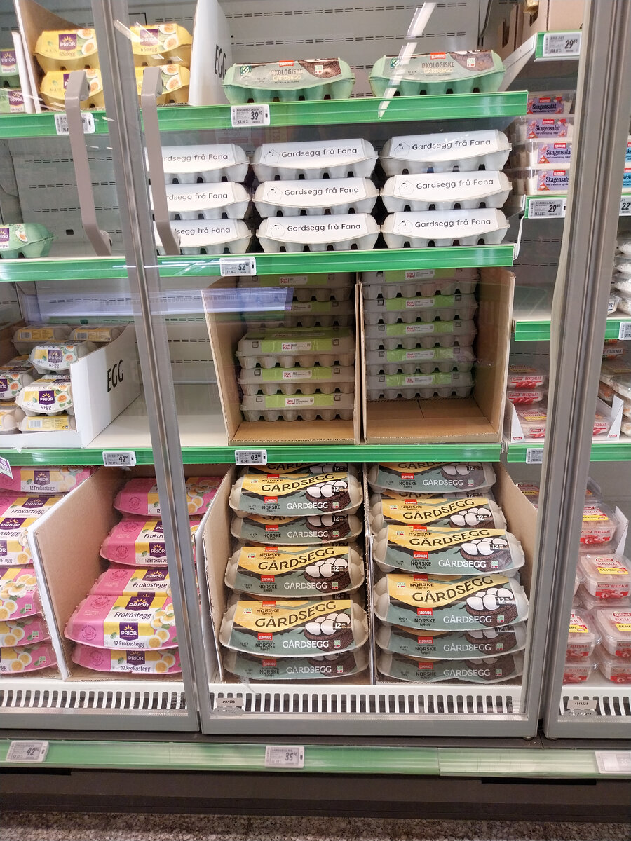 Так выглядит витрина с яйцами одного из местных супермаркетов. КИВИ. Эта сеть супермаркетов позиционирует себя как дешёвая, удерживающая цены на минимуме. Этакая "норвежская Пятерочка", как выразился один из комментаторов. Но удерживание цен на качестве продуктов не сказывается. Как видно на снимке, яйца в магазине фермерские. Вот надпись большими буквами на упаковке Gårdsegg. Что в переводе означает "фермерская упаковка". На Западе Норвегии нет крупных птицефабрик. Содержание КРС, овец, птиц и лосося в садках строго регламентируется очень гуманным по отношению к животным норвежским законом об их защите , изданным ещё в 1935 году. Я обычно покупаю самые недорогие яйца Фест прайс. Это типа Красной цены. Но тоже продукция фермерских кур (надпись fra frittgående høner означает "от кур свободного выгула"). Количество яиц в упаковке в норвежских магазинах кратно 6. В моей пачке 18 яиц стоимостью 43.90 кроны. Получается за штуку надо заплатить 2,43 кроны. По курсу 8.56 рубля за