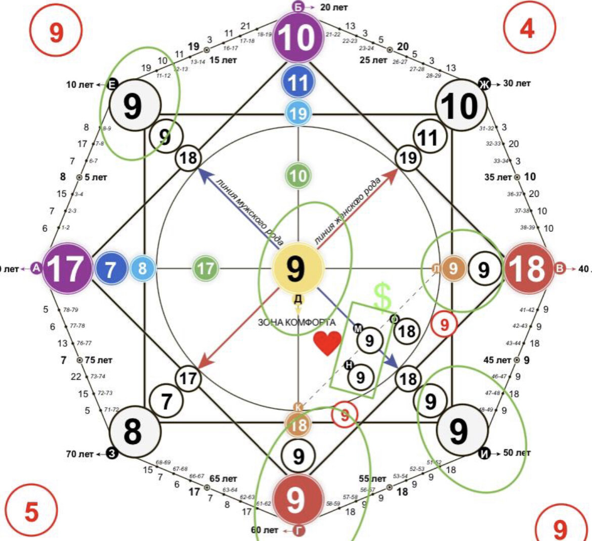 Ко мне обратилась девушка на консультацию. Запрос: не нравится род деятельности, не знает, куда уйти, страшно начинать что-то новое. Сразу скажу-это самый распространенный запрос среди моих клиентов) Еще информация о девушке: работает в офисе, работа однообразная, неинтересная, зп стабильная, расти некуда (если только кто-то из сотрудников уволится или уйдёт в декрет). Стабильность ее и держит. По образованию девушка педагог. И по большому количеству цифр 9 в ее матрице сразу видно, что это дело она очень любит. Вот ее матрица👇🏼 Посмотрите, девятка в центре, внизу их две, справа внизу, слева наверху.. если приглядеться, то и внутри матрицы девяток много. И когда я сказала, что с такими мощными показателями ей обязательно надо реализовать себя в качестве педагога, она испугалась. Говорит, не пойду в школу работать. А репетитором больших денег не заработаешь. Вот и всплыли наши основные проблемы: страх начать все с нуля и убеждение, что на дому денег не заработаешь… Смотрим дене