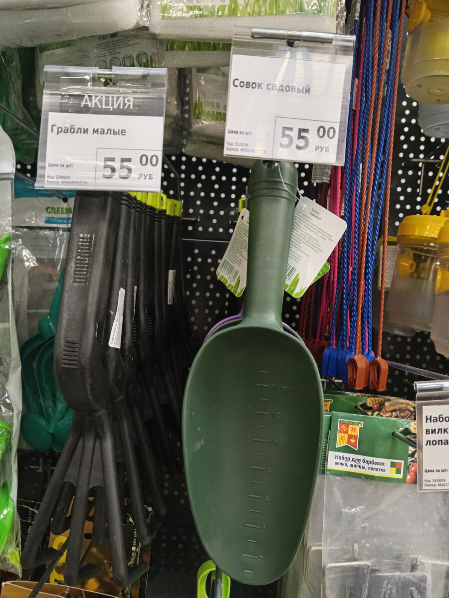 Грабли малые. Есть отверстие для вертикального хранения. Цена: 55 рублей. Совок садовый. Размер: 30х9 см. Состав: полипропилен. Цена: 55 рублей.