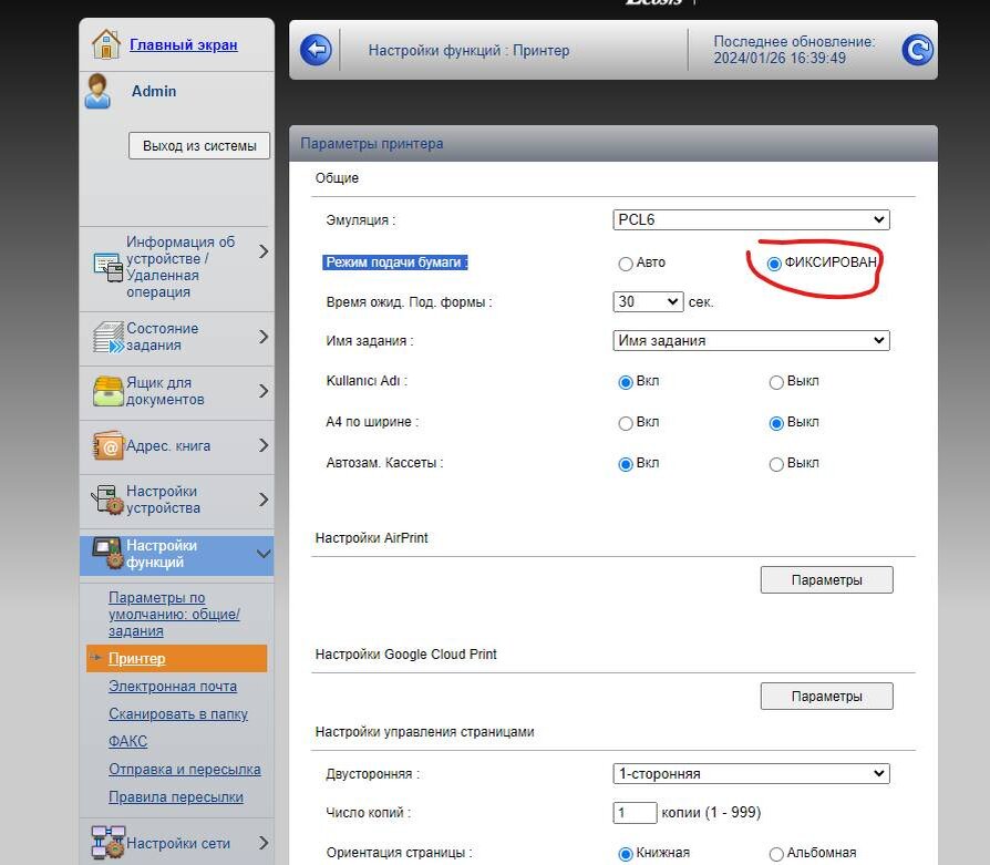 При печати документов формата, отличного от загруженного в кассету, МФУ выдает вышеуказанную ошибку. Решается установкой в настройках параметра как на скриншоте (для Киосер): P3155, мфу 2040 и их клонов с таким же кривым интерфейсом:
