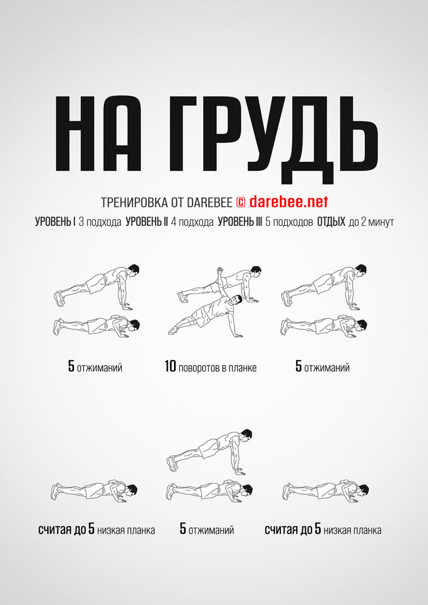 Новый релиз — На грудь. На Грудь — это домашняя фитнес-тренировка DAREBEE, которая обеспечит вам мощные грудные мышцы. https://darebee.net/pecs-workout.html ЦЕЛЬ: верхняя часть тела ТИП: сила СЛОЖНОСТЬ: 3 — подходит для начинающих