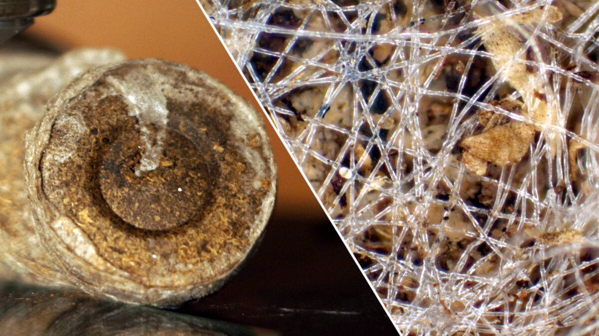 Подгнившие растения, окутанные паутиной — торфяная таблетка, увеличенная в 200 раз. Разумеется, сеть эта сплетена не восьминогой животинкой. Это спаянные синтетические волокна — нетканое полотно — возможно, спандекс. Да и далеко этому чуду текстильной промышленности до природной паутины. Сравните сами их толщину в едином масштабе. Тем не менее эта плетёная оболочка призвана удержать её содержимое, сохранить форму комочка. Конечно, пока таблетка не вступила в контакт с водой, выглядит она как шлиф камня. Впитав в себя достаточное количество влаги, торфяной брикетик заметно увеличивается в объёме, а его составные части отделяются, разворачиваются и принимают некогда былую форму. Торф — части отмерших растений с сильно заторможенным процессом разложения. Хорошо сохраняются листовые пластинки и покровные ткани стеблей. Клеточная структура хорошо просматривается. Содержимое клеток давным-давно испарилось. Теперь ткани больше похожи на каркасы гигантских сооружений. Структуру некоторых ткан