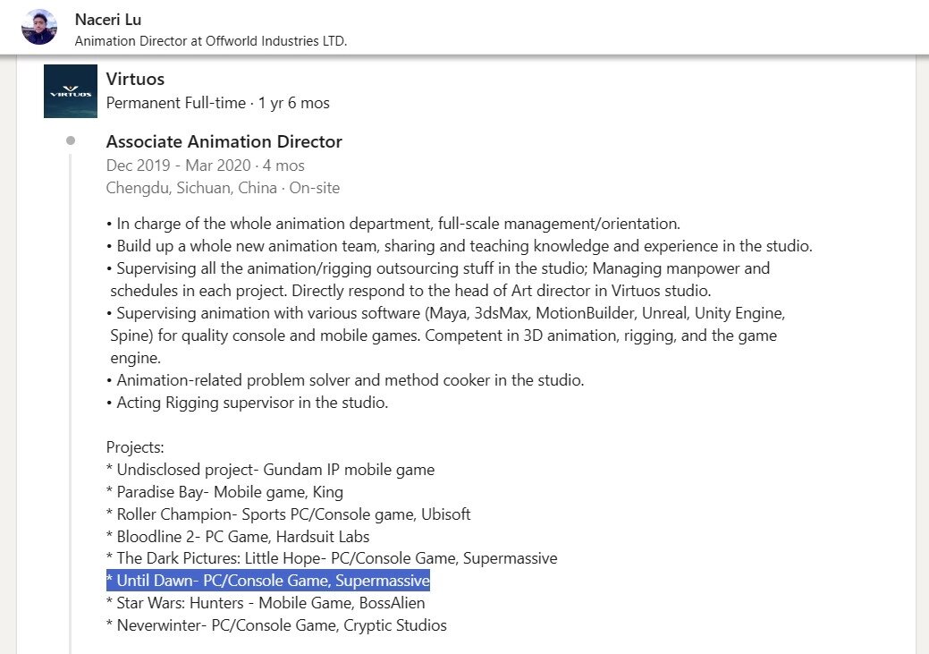 На днях известный инсайдер рассказал о возможной разработке и скором анонсе ремейка или ремастера интерактивного хоррора Until Dawn, и теперь появилось еще одно подтверждение существования обновленной версии известной игры 2015 года. У одного из бывшего разработчика студии Virtuos, специализирующейся на портах игр, в профиле на LinkedIn было замечено упоминание об участии в разработке версии Until Dawn для ПК и консоли. Это позволяет предположить, что компания Virtuos занималась переносом обновленного хоррора на персональные компьютеры. Как заявлял инсайдер на прошлой неделе, анонс новой Until Dawn должен состояться в течение 15 дней. Тем временем уже совсем скоро состоится презентация State of Play, на которой Sony собирается показать более 15 игр. И вполне возможно, что одной из них окажется обновленная версия хоррора.