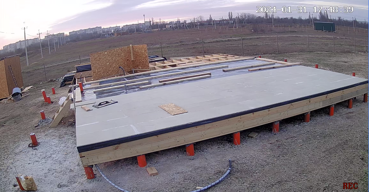 Погода дала несколько дней передышки без дождя. Теплом правда не балует, с утра ещё лёд на лужах. Но работать уже можно. Первым делом подняли листы осп, проверить состояние после дождей. Под листами на плёнке оказалась вода. ОСП снизу все листы намокшие. Приняли решение немного изменить конструкцию. Не обошлось без небольших убытков. ОСП (снятые листы) строители решили не использовать, они намокли и при такой погоде сушить их не вариант. Решили поменять местами ОСП и плёнку. Плёнку сняли, она уже восстановлению не подлежит, хорошо, что взял с запасом. Теперь эковату сверху сразу закрываем ОСП, на неё стелим пленку и на плёнку стелим Квик дек с проклейкой стыков клеем ПВА водостойким. Для надёжности сверху швы ещё пройдёмся герметиком. Теперь получается идеально ровный пол, готовый под чистовую отделку. Сверху на время сборки остального каркаса закроем его обычной плёнкой. До конца недели перекрытие должно быть готово. Как раз до очередного дождя в воскресенье. Погода в этом году что-то