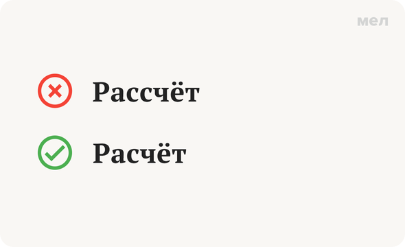 Очередной коварный трюк русской грамматики — существительное, правописание которого не стоит пытаться объяснить логически, его надо просто запомнить. Как и правописание образованного от него глагола, который пишется по-другому. Правильно: расчёт Без лишних реверансов озвучим правило: существительное «расчёт» пишется с одной «с», потому что имеет корень «чёт» и приставку «рас-». Такой же корень имеют слова: При этом образованный от существительного «расчёт» глагол «рассчитывать» пишется с двумя «с», потому что имеет корень «счит» и приставку «рас-». А глагол «расчётный» — с одной. Образованные от того же существительного прилагательные «расчётный» и «рассчитанный» пишутся по-разному: первое — с одной «с», второе — с двумя. Так же, с двумя «с», пишется и прилагательное «рассчитываемый». Такие дела. В общем, живите теперь с этой информацией, а в идеале постарайтесь ее запомнить. И традиционно несколько примеров в помощь: Еще больше веселых и полезных карточек о русском языке — в «Грамотно