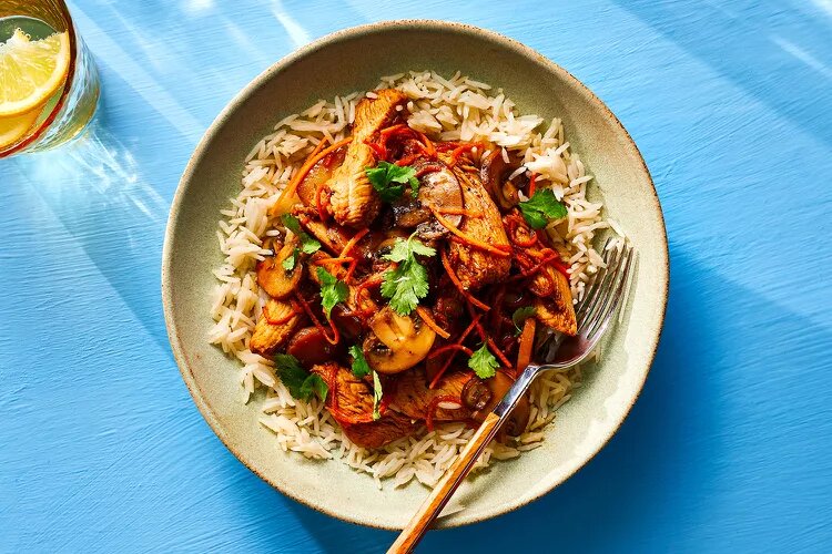 - Продолжайте готовить, пока курица не прогреется до готовности, а морковь не станет хрустящей и нежной, еще около 1 минуты.