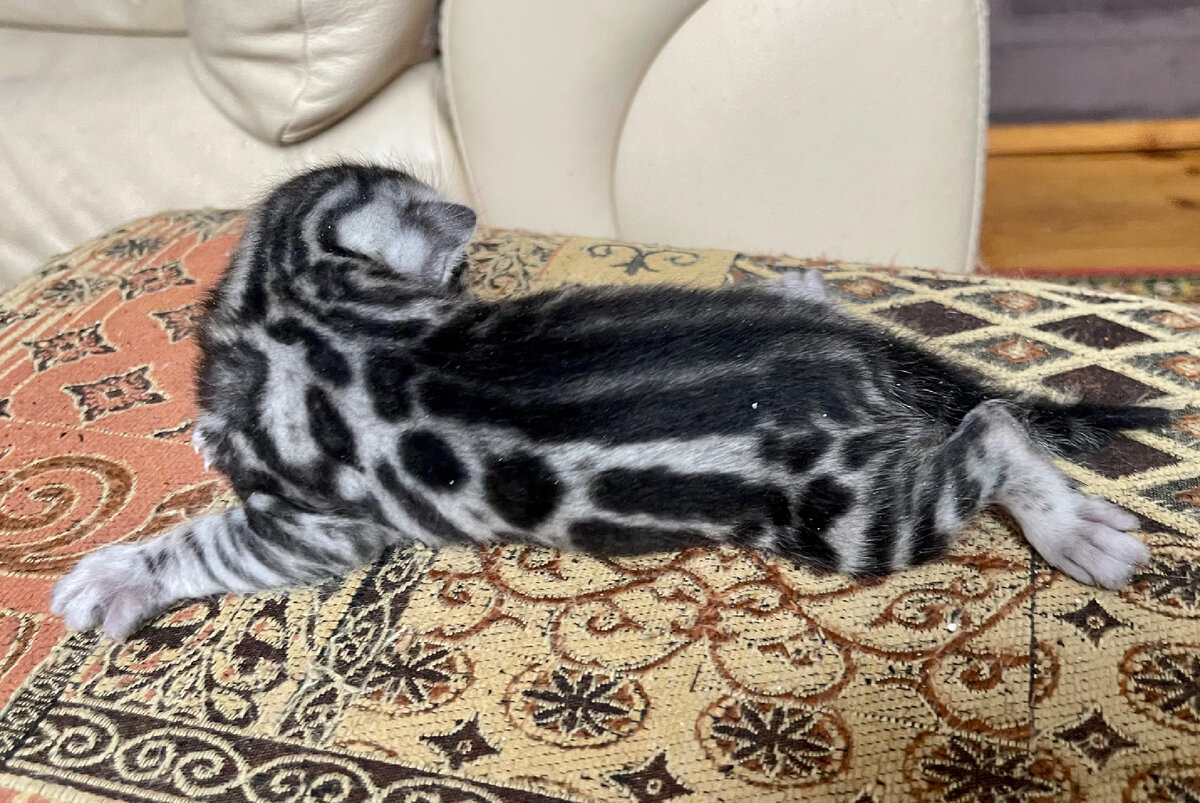 Обыватель знает золотых бенгалов. В розеточку. А что в тренде? Элита - для элиты. Это серебро! Черное по белому - высший шик! Этот окрас формируется долго и обыватель его не понимает. Ну а потом кричит - хочу такое!!! А такое оно не сразу, как и снежные. Фазинг в серебре пострашнее, чем в золоте. Вот эту неяркую кисю я купила за 150 т.р. Как супер-перспективного производителя. Из Хабаровска. Тип, шерсть, чистота фона. И добавить к типу контраст и выбеленность - сможем! А прокрасится - в красотку! Яркость, контраст, фон, выбеленность - много нюансов… играем в паззлики!