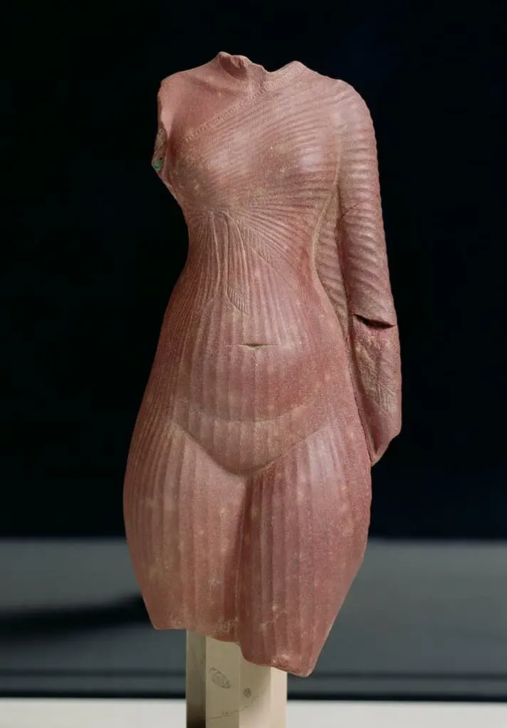 Статуя изображает женщину, одетую в облегающее льняное платье со складками. Льняное плиссированное одеяние с бахромой, завязанное под правой грудью, совершенно не скрывает ее преувеличенно чувственную фигуру: Нефертити сохраняет четко очерченную талию, но у нее округлый живот, широкие бедра и ярко выраженные тяжёлые ягодицы, которые напоминают нам о том факте, что она родила, по меньшей мере, шестерых детей. Ее живот выделяется единственной изогнутой линией у основания живота, чуть выше. Бюсту, тем не менее, здесь уделено мало внимания. Обычная одежда Нефертити - прозрачная плиссированная туника, подвязанная под грудью - позволяет нам ясно видеть ее тело: Очень часто Нефертити носит открытое гладкое одеяние, оставляющее одно плечо обнаженным. В качестве альтернативы Нефертити надевала платье, такое тонкое и облегающее, что сквозь складки видна вся ее фигура.