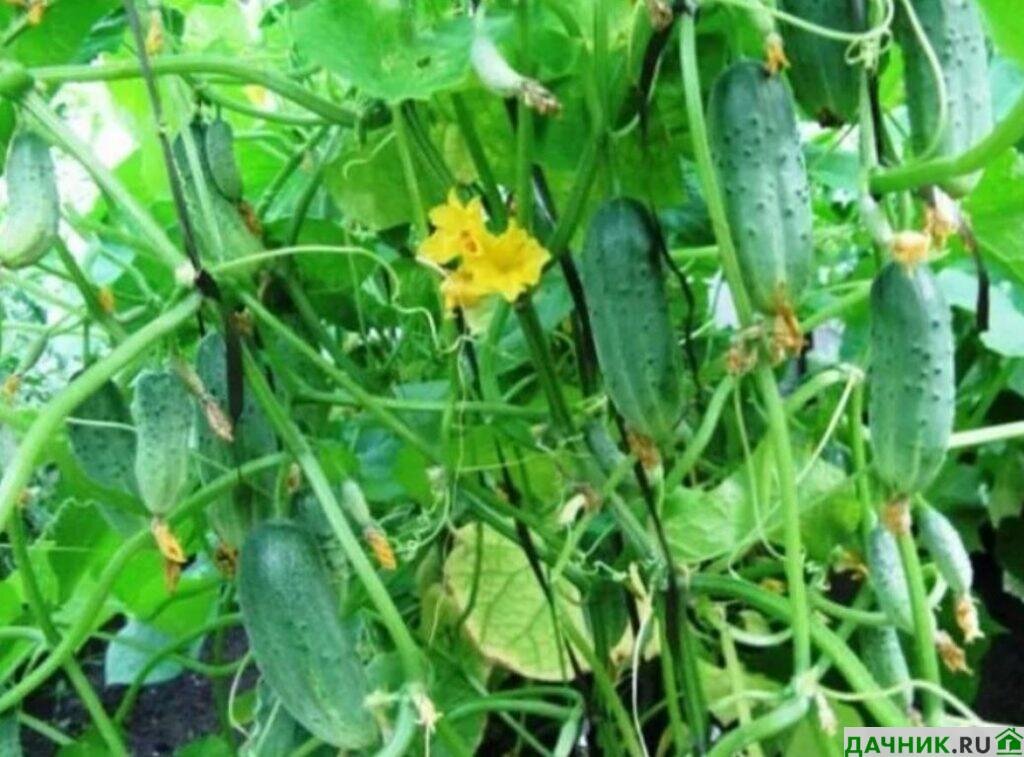 - Время плодоношения относительно короткое. Из-за того, что на кустах находится только женское цветение, завязи могут быть даже на крайних нижних узлах огуречного растения. Более того, погода не влияет на данный процесс;