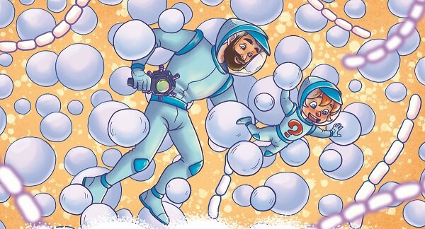 — Опять подводное плавание! Впереди по курсу бактерии, похожие на те, что были в простокваше. Но рядом с ними какие-то воздушные шары в несколько раз больше бактерий! А на боках у этих воздушных шаров растут шарики поменьше. Не бактерии, а какие-то игрушки-неваляшки или снеговики! И ещё вокруг множество пузырьков, но они вообще не похожи ни на что живое, кажется, это просто газ.