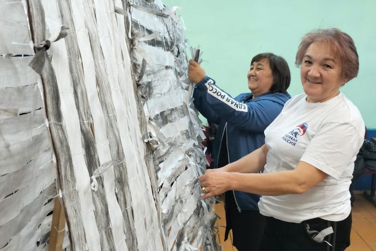 Здесь кипит работа с утра до вечера — кройка, шитье и плетение. Женщины-добровольцы действуют со знанием дела: ленточка к ленточке, метр за метром создается необходимое для защитников маскировочное полотно, которое будет надежно укрывать и делать незаметным для врага наших бойцов и технику. Секретарь первичного отделения Ильза Кинзябулатова рассказала о деятельности волонтеров. «Все получилось благодаря совместной работе неравнодушных жителей. Сначала мы написали объявления в чатах, а затем начали работу. Нужно сказать, откликнулись многие сельчане, которые переживают за своих, за страну и хотят внести вклад в общее дело. А среди работниц есть те, кто проводил своих близких, братьев, сыновей, мужей в зону специальной военной операции, и, конечно, хочет в меру возможности помочь бойцам», — говорит она. С начала плетения волонтерами изгот