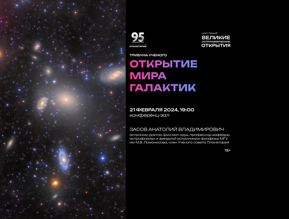 В конференц-зале Планетария выступит Анатолий Владимирович Засов – известный астроном, доктор физико-математических наук, профессор кафедры астрофизики и звездной астрономии физического факультета МГУ им М.В. Ломоносова, действительный член Международной АН ВШ, член Международного астрономического союза (МАС), член Европейского астрономического общества, член Евроазиатского (стран бывшего СССР) астрономического общества, член Ученого совета Планетария. Тема лекции: "Открытие мира галактик". Сто лет назад был сделан эпохальный шаг в науке – удалось определить расстояния до ближайших звездных островов – галактик, что позволило увидеть, как непредставимо далеко простирается мир, доступный нашим прямым наблюдениям. Родилась астрономия сверхдалеких объектов Вселенной за пределами нашей Галактики – внегалактическая астрономия, которая привела ко многим неожиданным открытиям. Лекция сопровождается презентацией. После лекции все желающие могут задать вопросы ученому по представленной теме. Ин