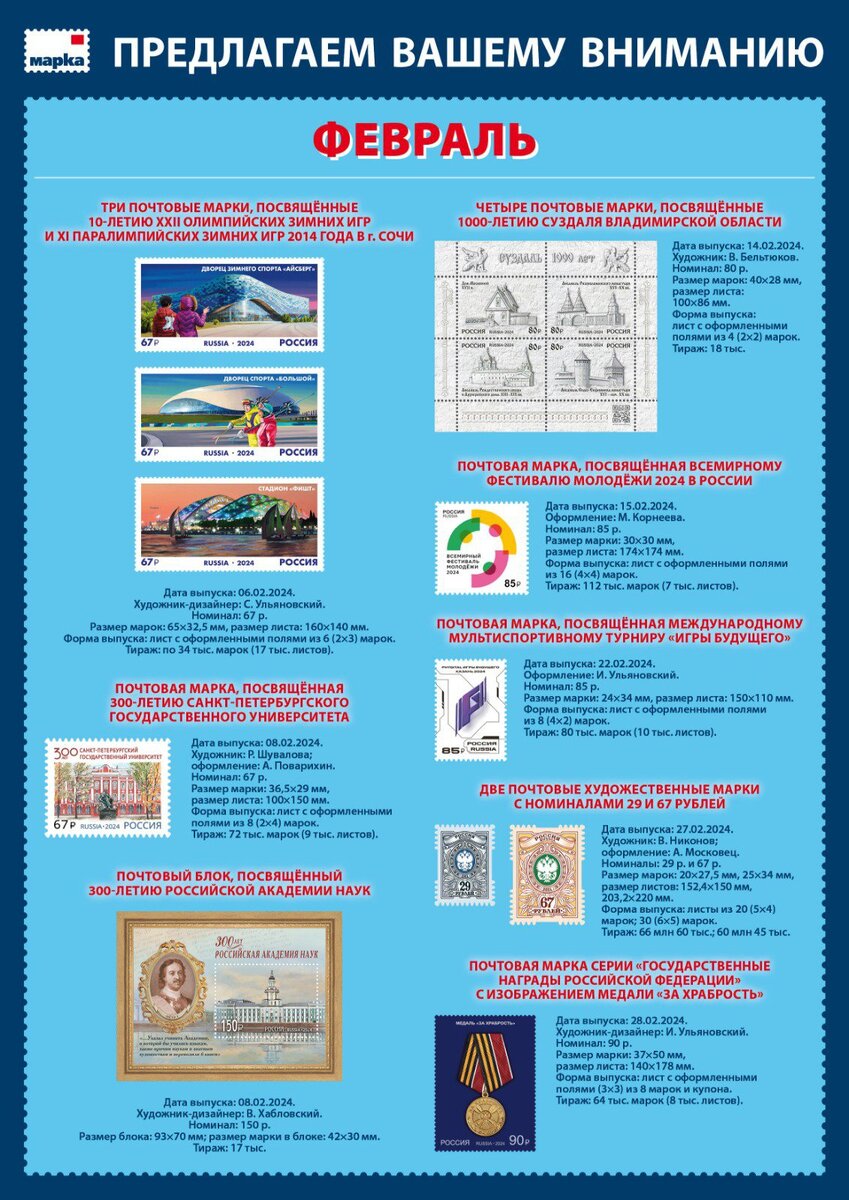 Акционерное Общество "Марка" (РусМарка) опубликовала план выпуск знаков почтовой оплаты (почтовых марок) на февраль 2024 года. #филателия #марки #РусМарка