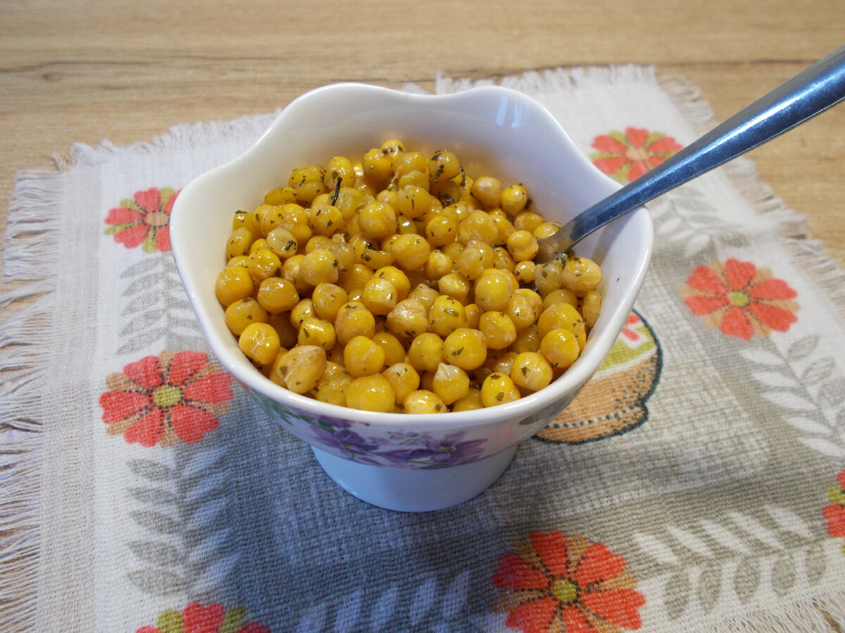 Нут (турецкий горох) все больше пользуется популярностью. Из нута можно приготовить много блюд. Наиболее известные хумус и фалафель. Но из нута можно приготовить суп, пюре, котлеты и даже конфеты. Я предлагаю приготовить закуску из нута. Ее можно погрызть вместо чипсов или сухариков. Нут промойте и залейте водой на ночь. Переложите нут в сотейник, залейте водой и варите до готовности. Я варила 40 минут. Мягкий нут выложите в чашку, посолите и добавьте сливочное масло. Перемешайте. Добавьте пряности и хорошо перемешайте. У меня сушеный укроп и петрушка. Выложите нут на противень. Запекайте нут при 180* 15-20 минут. Вот и все - вкусная закуска готова!