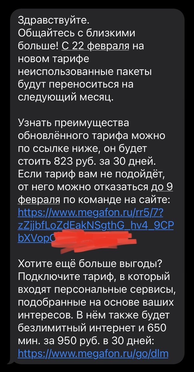 Простите, первый пост и жалоба, постараюсь по делу без эмоций. Цель дать огласку и предупредить пользователей. Тема не свежая, но схема с тарифами для меня новая. Для ЛЛ: Мегафон рассылает уведомления «мы вам меняем тариф. В течение 20 дней вы можете отказаться, но если промолчите — вы согласны»! Получил сегодня такое смс, конечно же как всегда тариф «с очень выгодными для вас условиями, а главное персональный!. (на всякий случай затер ссылку, там «персональные» предложения)