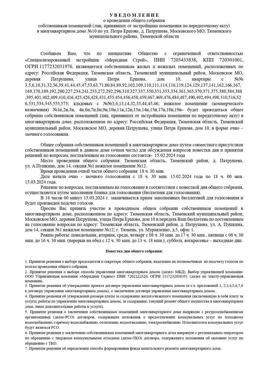 Приглашаем Вас принять участие в общем собрании собственников помещений многоквартирного дома №10 по ул. Петра Ершова, д. Патрушева, Московского МО, Тюменского муниципального района, Тюменской области Место проведения очного этапа собрания: Тюменская область, Тюменский район, д. Патрушева, ул. А. Пушкина, дом 14, секция №1 нежилое помещение №12 15.02.2024 года в 18 ч. 30 мин. Заочное голосование до 18ч. 00 мин. 15.03.2024г. Кантатный телефон: +7 (3452) 500-614. Инициатор проведения общего собрания: Общество с ограниченной ответственностью «Специализированный застройщик «Меридиан Строй»