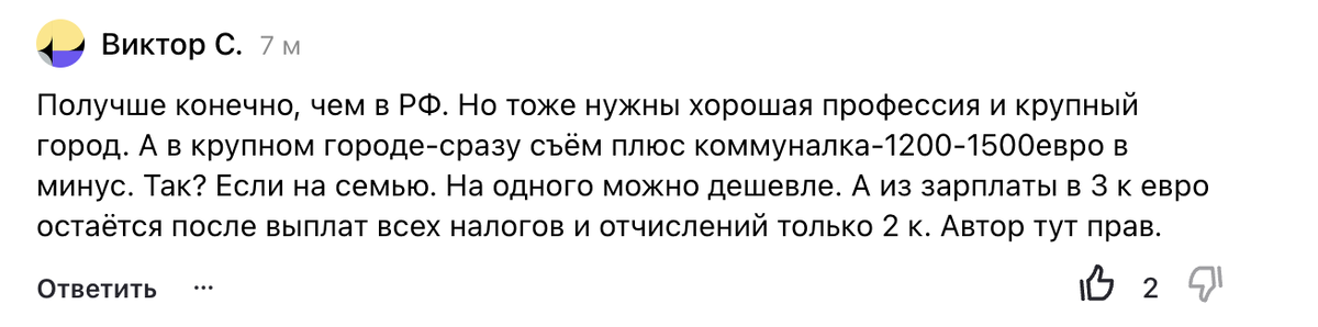 Спасибо @Виктор С. за обратную связь к моей статье! Отвечаю вам: Вы совершенно правы, зарплаты большие, но, опять же, всё зависит от города и профессии. Если работать врачом, юристом или политиком, можно жить припеваюче всю жизнь. Но с обычными профессиями труднее. Дорогая Жизнь в Германии: Считается, что Германия – одна из самых дорогих стран для проживания в Европе. Затраты на аренду жилья, медицинское обслуживание и образование могут быть значительными. Однако высокий уровень заработной платы и социальная защита обычно компенсируют эти затраты. Сколько Стоит Жизнь в Германии: Стоимость жизни в Германии может значительно варьироваться в зависимости от региона и образа жизни. Средние расходы на месяц для одного человека, включая аренду жилья, питание, коммунальные услуги, транспорт и развлечения, могут составлять от 1,500 до 2,500 евро. Однако эти цифры могут изменяться в зависимости от индивидуальных предпочтений и жизненного стиля. В итоге, культура экономии и эффективного управле