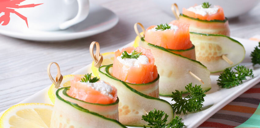 Ингредиенты: Для начала рыбу нарезаем тонкими ломтиками, огурцы — тонкими длинными лентами. Затем на каждый кусочек рыбы выкладываем сыр и заворачиваем, чтобы получился небольшой рулетик. Каждый рулетик оборачиваем огуречной лентой и закрепляем шпажкой. Украшаем закуску веточками петрушки. Блюдо готово. Приятного аппетита! Источник: https://wildcrab.ru/news?id=2307