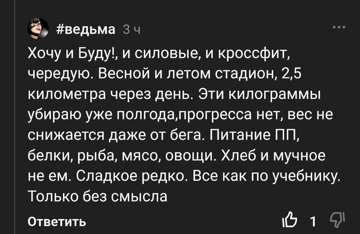 Мол, что только эта женщина ни делала: и кроссфит, и бег, и силовые, и низкоуглеводное питание, а результат по нулям!