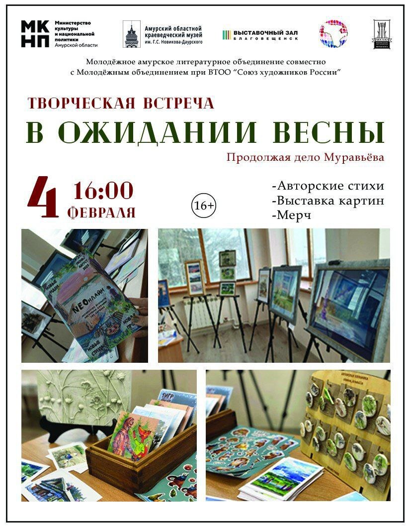 Жители и гости города Благовещенска! Приглашаем вас на вторую Творческую встречу «Продолжая дело Муравьёва», организованную Молодёжным амурским литературным объединением и Молодёжным отделением Союза Художников! Встреча состоится 4 февраля в 16:00 в Выставочном зале. Молодые амурские писатели и художники поделятся своими стихотворениями и картинами, охватывающими темы уходящей зимушки и приближающейся весны. Лейтмотивом встречи будет звучать любовь! На встрече вас ждут: После встречи продукцию с творчеством молодых амурских поэтов и художников можно будет приобрести. Приходите и окунитесь в атмосферу амурского творчества! Стоимость входного билета 300 руб Тел для справок: +7 (4162) 51-00-05 #творческаявстреча #коллаборация #выставка #художественнаявыставка #поэтическиечтения #выступлениепоэтов #современныепоэты #открытиевыставки #культура #благовещенск #досуг #мероприятияблаговещенск #художники #встречасхудожниками #искусство #читаемстихи