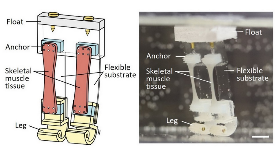 Японские биоинженеры из Токийского университета создали уникального мини-робота, ноги которого приводятся в движение синтетическими мышцами. Информация о разработке опубликована в журнале Matter. Новое направление Миниатюризация роботов вынуждает инженеров искать новые решения, так как обычные электромоторы с уменьшением размеров сильно теряют в мощности и надежности. Одним из перспективных направлений сегодня — биогибриды, в конструкции которых используются искусственно выращенные биологические ткани. Уникальный биогибрид В решении проблемы уменьшения размеров робота японские инженеры под руководством Сёдзи Такэути использовали искусственно выращенные мышцы. Корпус был выполнен из полидиметилсилоксана. В нижней его части находятся два гибких плоских «отростка», выполняющие функцию ног. Они-то и приводятся в движение с помощью искусственно синтезированных мышечных волокон. Сокращение мышц биогибрида осуществляется под воздействием электростимуляции. Таким образом робот способен шагат