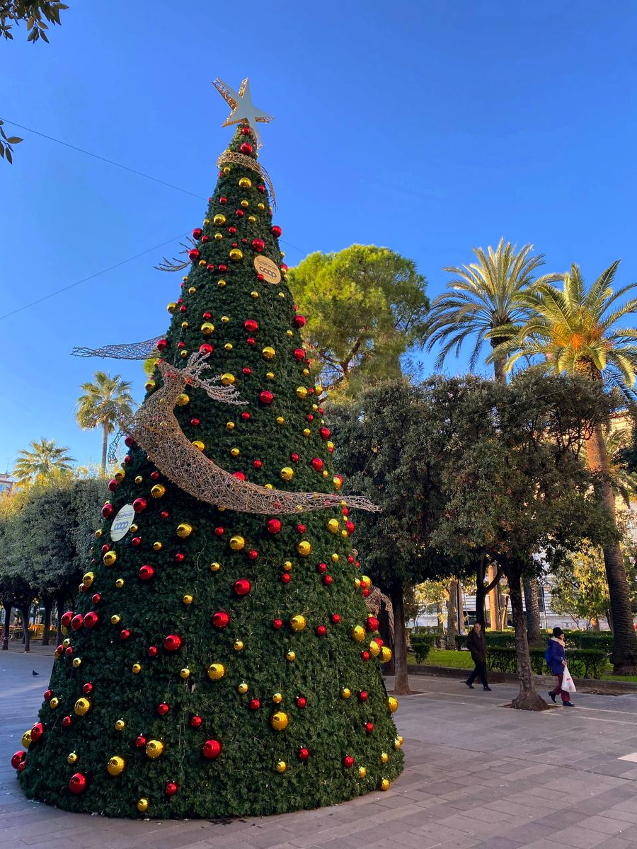 Новогодняя обстановка по-итальянски – это креветко-олени на искусственной елке на фоне пальм и КАТОК. Да, тоже под пальмами. На улице в этот момент +19 градусов. Очень нравится.