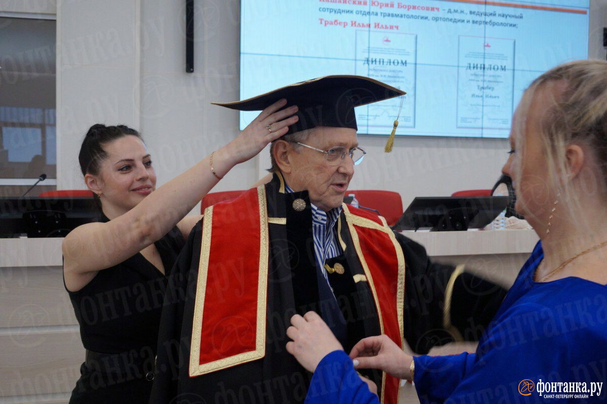 «Облачайся!» На Илью Трабера надели мантию Впервые почетным доктором Института им. Джанелидзе избран категорически не врач. «Фонтанка» подсмотрела, при чем тут академическая медицина и знаковый петербуржец. В актовом зале Санкт-Петербургского научно-исследовательского института скорой помощи имени И. И. Джанелидзе к обеду 1 февраля не только отметили 92-летие известной клиники, но назвали и нового почетного доктора. По информации нашего издания, на встрече с врачами присутствовал крупный петербургский бизнесмен Илья Трабер. Когда его вызвали, директор больницы Вадим Мануковский по-свойски обратился к нему на «ты»: «Облачайся!» А руку пожал вице-губернатор Петербурга Олег Эргашев. До этого почетными врачами назывались только профессионалы здравоохранения. В данном случае уважение настигло Трабера благодаря его финансовой помощи НИИ скорой помощи. В свойственной ему вольной и ироничной манере Трабер ответил: «Не знаю, где принято говорить о героизме спонсорства, а у меня не принято. С та