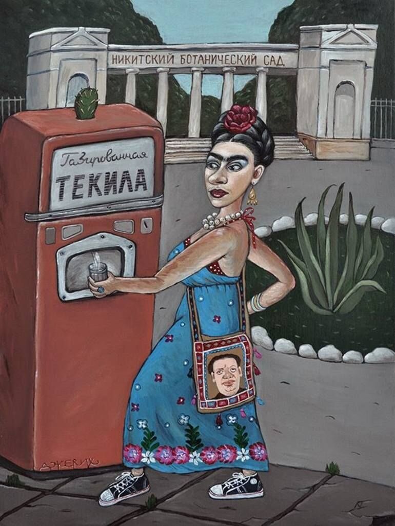 Вчера я крепко задремала И мне приснился странный сон - Текилу хлещет Фрида Кало, Начхав на соль и на лимон! Постыли Мексики пейзажи, Давно скучает чистый холст. Увидеть бы в Крыму ей пляжи И знаменитый чудо-мост! На мужа Фрида смотрит хмуро, Нахмурив грозно монобровь, А он грозит ей агентурой, Что там-то ей попортят кровь! Что вся российская элита Бежит, поджав роскошный хвост, Зачем же, дорогая Фрида, Катить туда за тыщу вёрст? Немножко денюжек подкопим И съездим вместе на Бали. А щас ровней сиди на попе, И такос с сальсой заверни! Но феминистка Фрида Кало И мужики ей не указ: "Нет, я уже собралась, А ты лечи свой ишиас!" Собрала быстро чемоданчик: Блокнотик, кисти, карандаш И неизменный свой стаканчик, Не антиквариат - винтаж! И вовсе даже не Пегасом, (Такой бы рейс был трудноват), А самолетом бизнес-классом В Россию, в Крым, в Никитский сад! И вот в просторном сарафане, Запив текилою эклер, И бутербродом в целлофане, Выходит Фрида на пленэр. Она писала с упоеньем И полно