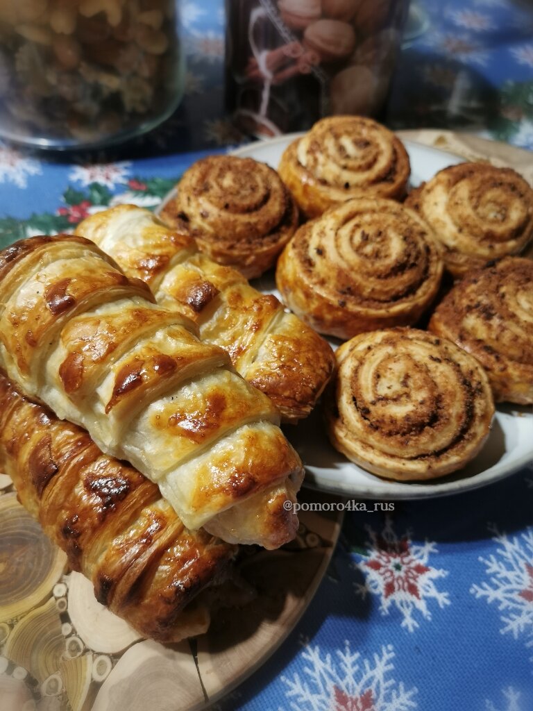 #рецепт 🥓🌭Сосиски в тесте с беконом и 🥯улитки с корицей. В скобочках указала продукты, которые я люблю использовать. 🌭Сосиски: - 6 сосисок (у меня "Сочные" из "ВкусВилл"); - 1 пласт слоёного теста ("Морозко" дрожжевое); - 6 полосок бекона ("Ближние горки" для жарки). Бекон придаёт сливочный вкус; - соль, молотый перец для бекона; - смесь для смазывания: 1 желток + 1ст.л. молока + щепотка соли + 1ч.л. сахара. Смеси хватило для 2х пластов теста. Заранее бекон натереть солью с перцем и оставить при комнатной температуре минимум на час. Заранее достать тесто из морозилки. Вытащить пласты и разложить по-одному. Оставляю их на развёрнутой упаковке примерно на 1 - 1,5 часа. Тесто прикрыть полотенцем, т.к. оно подсыхает. Обмотать сосиски беконом. Пласт теста разрезать на 6 равных полос. Растянуть полоску и обернуть сосиску. Смотрите на ВИДЕО ⬇️ как я это делаю. Смазать "спиральки" смесью. Выпекать 15 минут при 200'С. Пока выпекаются сосиски займёмся улитками. 🥯 Улитки: - 1 пласт с