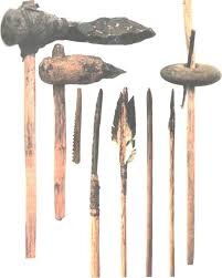 В мезолите появляются зачатки земледелия. Его признаки находят в верхнем слое пещеры Шандар, в поселении Зави-чеми в Ираке 13-11 тыс лет назад, в Палестине и Иордании 10 тыс лет назад. Найденные там жатвенные ножи, ступки, мотыжки, песты служили, скорее всего, доя сбора и обработки дикорастущих злаков. Следов ткачества в мезолите не обнаружено. Слова доя справок: 1. Ступка (др. ступа) - инструмент для толчения чего либо. 2. Песты - молодые побеги растения «Хвощ полевой» которую использовали как инструмент для толчения в ступке. *На фото изображены: Орудия труда и охоты с микролитическими элементами.*