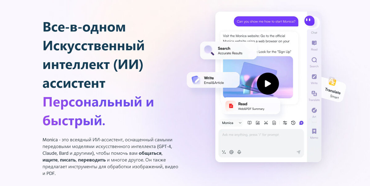 🔥 Monica - ваш универсальный помощник AI GPT-4. Мы помогаем в таких задачах, как поиск, чтение, написание, перевод, рисование и многих других. 💪 Моника платная, поэтому регистрируйся по этой реферальной ссылке и получишь бесплатные пробы. (И я тоже получу, спасибо 🔥)