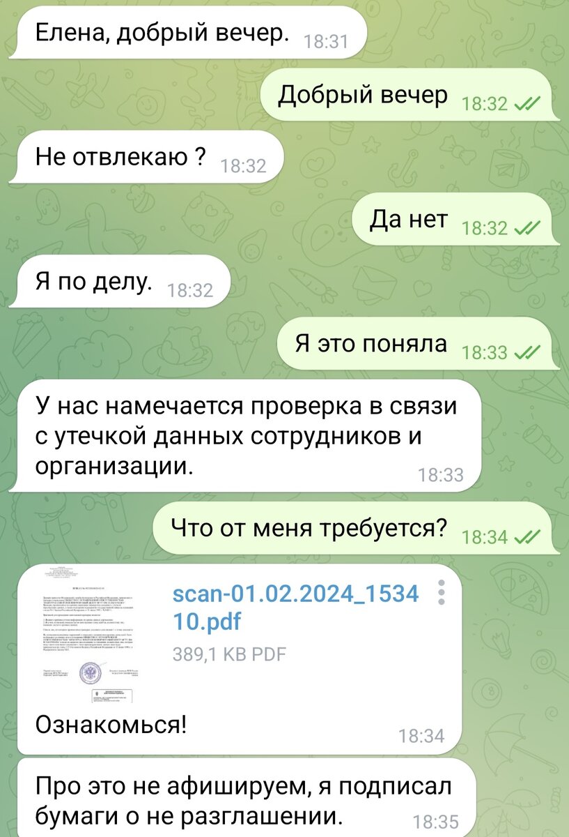 Я сейчас расскажу как меня на днях пытались развести мошенники, но прежде немного предыстории, чтобы вы понимали мою изначальную реакцию: Пятый год работаю в Москве в производственной компании, открытой на грант Правительства Москвы. Грант получил, если не самый лучший, то один из самых лучших технических вузов в России, который носит имя известного революционера. Собственно, этот ВУЗ и является нашим учредителем. У него есть и инжиниринговый центр, одним из проектов которого и является наше предприятие. Центр нас курирует и по сей день. Первые года 2 я была трудоустроена в инжиниринговый центр и в сам ВУЗ, который относится к предприятиям ОПК, разработками занимается, я всякие документы о неразглашении подписывала, автобиографию писала. В четверг вечером мне приходит в телеграме сообщение. Отправитель - фамилия и имя совпадает с гендиром инжинирингового центра. Я с ним знакома, он периодически бывает у нас на производстве, но номера его нет. Если нажать на сам контакт, то в описании к