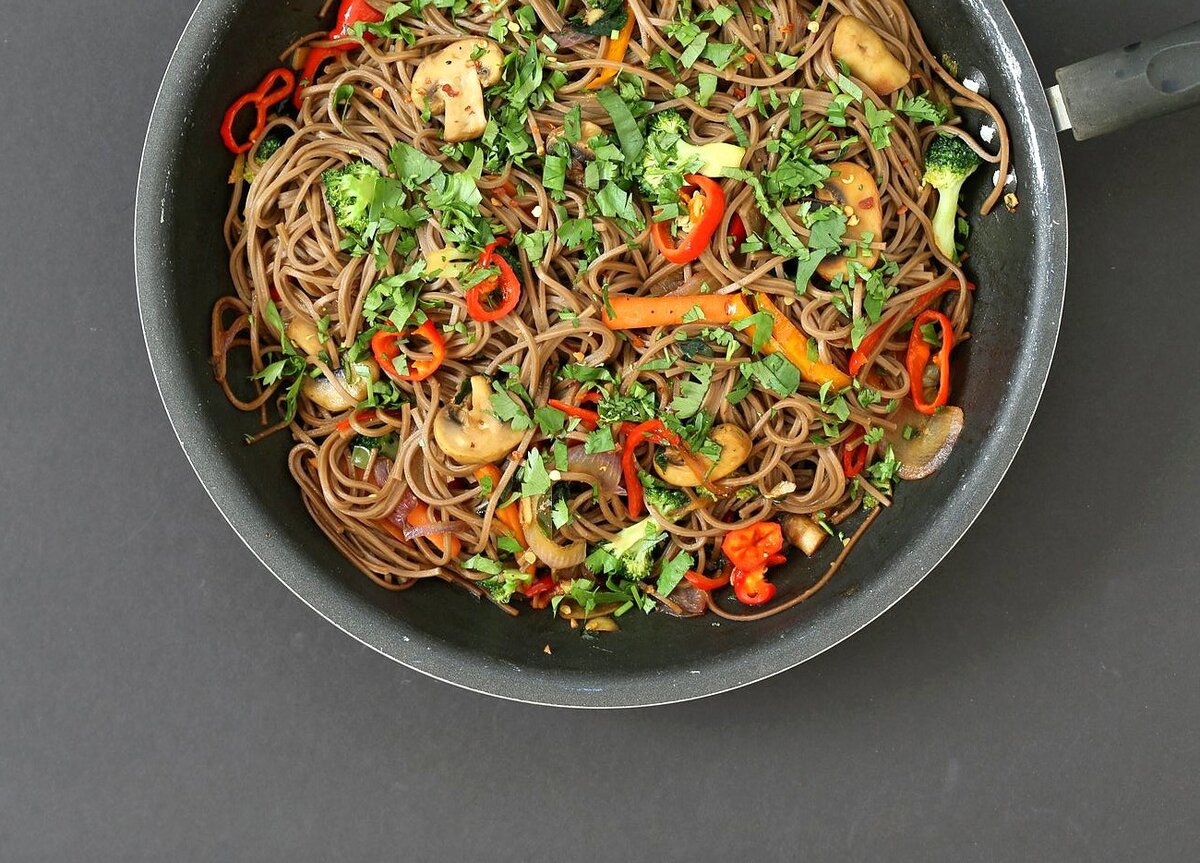 - Добавьте в сковороду отварную гречневую лапшу и все хорошенько перемешайте - прогрейте лапшу с овощами и грибами на среднем огне в течение 1-2 минуты, снимите с огня.