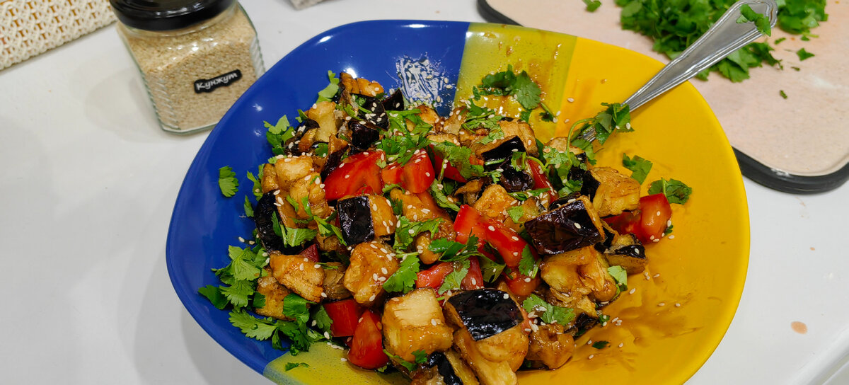 Салат с хрустящими баклажанами в кисло-сладком соусе. Лаззат.