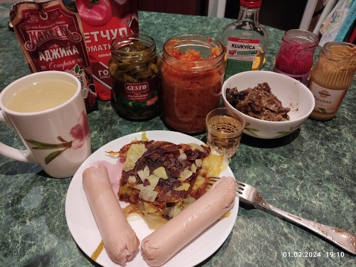 А то мне в упрек ставили, что для аппетита по чуть-чуть не употреблял))) 200 миллилитров "клюквенной" самый оптимальный объем для ужина))) 4 Картофеля, луковица, подсолнечное масло... Минимум для вкусной жареной картошки))) Почистил это всё. Нарезал тонкими пластинами. Разогрел масло подсолнечное. Выложил картофель на сковородку. Мелко нарезал лук. Теперь можно и по пятьдесят для аппетита. На столе закуска. Остатки из холодильника: говядина вчерашняя, перец холопенью, салат овощной, булочка))) Картошка жарится. Добавил лук. И чуть позже посолил. К картошке добавил пару подкопчённых сосисок. Приятного мне аппетита. Ваше здоровье!!! Пост автора makar80. Комментарии к посту на сайте Пикабу.