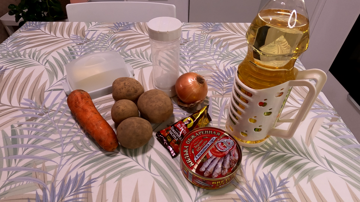 Суп из кильки Для приготовления: Килька 1 банка Вода 2 литра Картофель 2-4 шт. Морковь 1 шт. Лук 1 шт. Томатная паста 70 гр. Масло сливочное Масло подсолнечное Соль Рецепт: Чистим картофель и отправляем в кастрюлю с водой, ставим на сильный огонь, после закипания снимаем пену и солим и плиту делаем тише на 5/10. Варим 10 минут. Чистим лук и морковь. Разогреваем сковороду с кусочком сливочного и небольшим количеством подсолнечного масла. Нарезаем мелко лук и отправляем в сковороду. Затем крупными кубиками нарезаем морковь и отправляем к лук. Жарим 10 минут. Перекладываем морковь и лук в кастрюлю. Варим ещё 5 минут. Затем добавляем банку кильки, перемешиваем. При необходимости можно добавить ещё воды. Доводим до кипения. В суп добавляем 2 столовые ложки (70 грамм) томатной пасты, хорошо перемешиваем. Варим ещё 5-7 минут. Суп готов! Приятного аппетита.
