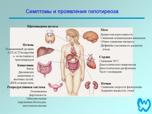 Я – Дайна, стараюсь сложные медицинские темы объяснить простыми словами После вчерашней статьи наверняка кто-то задумался, а может во всем виновата моя щитовидка? Каждой, у кого есть лишний вес, очень хочется объяснить его накопление сниженной функцией той же щитовидки, то есть гипотиреозом. Ведь тогда не нужно соблюдать диету, ограничивать себя, – выпил таблетку, и похудел! Это же просто мечта! Если бы все было так просто… Да, щитовидная железа регулирует интенсивность обменных процессов и метаболизма. Но, в реальности, гипотиреоз встречается не так часто. И это болезнь! Ее лечат, корректируют, врачи серьезно беспокоятся, когда видят ее признаки. Гипотиреоз – страдание, а не просто лишний вес: апатия, абсолютно нет сил, отеки, разные боли, одышка при любой нагрузке... На картинке показано, что нарушается при гипотиреозе: Источник: Яндекс Тяжелый гипотиреоз называется микседема, и таких больных легко узнать: отечное лицо, распухшие руки и ноги, практически не видно глаз под набрякшими