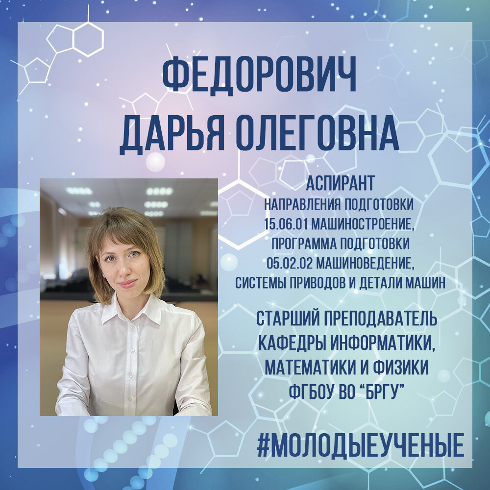 Дарья Олеговна является старшим преподавателем кафедры Информатики, математики и физики ФГБОУ ВО «БрГУ», а также продолжает обучение в аспирантуре по направлению подготовки 15.06.01 Машиностроение, программа подготовки 05.02.02 Машиноведение системы приводов и детали машин. За период учебы и работы в Братском государственном университете Дарьей Олеговной было опубликовано 10 научных работ. Наиболее значимые научные труды/разработки: 1. Применение методов обработки естественного языка к задачам поиска и сравнения изображений / Д.О. Федорович // Труды Братского государственного университета: Серия: Естественные и инженерные науки. – Братск : Изд-во БрГУ, 2022. -253 с. 2. Экспонента кривой разгрузки предварительно нагруженной сферы плоской жесткой поверхностью (статья) // П.М. Огар, Д.О. Федорович // Системы. Методы. Технологии. -2020. - №3. –с. 21-27. 3. Формирование мотивов учебной деятельности в условиях контекстного обучения (статья) // Д.О. Федорович // Совершенствование качества обр