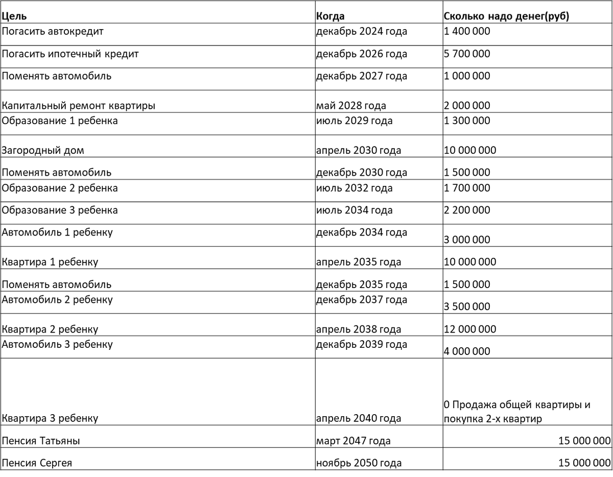 Да, именно так, в семье Татьяны и Сергея с 01 декабря 2022 года началась новая жизнь. Анализ предыдущей уже проведен и по его результатам были принято решение, как жить дальше. С новым бюджетом, без кредитов и психологов, с новым подходом к тратам на необходимые для семьи товары и услуги. Первое, что мы сделали это составили таблицу целей. Вот такая получилась таблица. В ней только крупные цели. Некоторые (например, отпуск) учтены в бюджете, более мелкие такие как покупка телефона, телевизора и так далее заложены в Финансовую подушку безопасности. Следующий шаг — это определить стартовые возможности. Имеем следующее: 1. Остаток семейного бюджета за декабрь 170 000 руб. 2. Внеплановый доход за декабрь от бизнеса Татьяны 75 000 руб. 3. Деньги с кредитной карты 750 000 руб. 4. Февральский бонус Сергея 300 000 руб. ИТОГО на старте в нашем распоряжении 1 295 000 руб. Так же в нашем распоряжении есть заложенные в бюджет семьи нерегулярные расходы и по итогам декабря: - Одежда и обувь 7 000