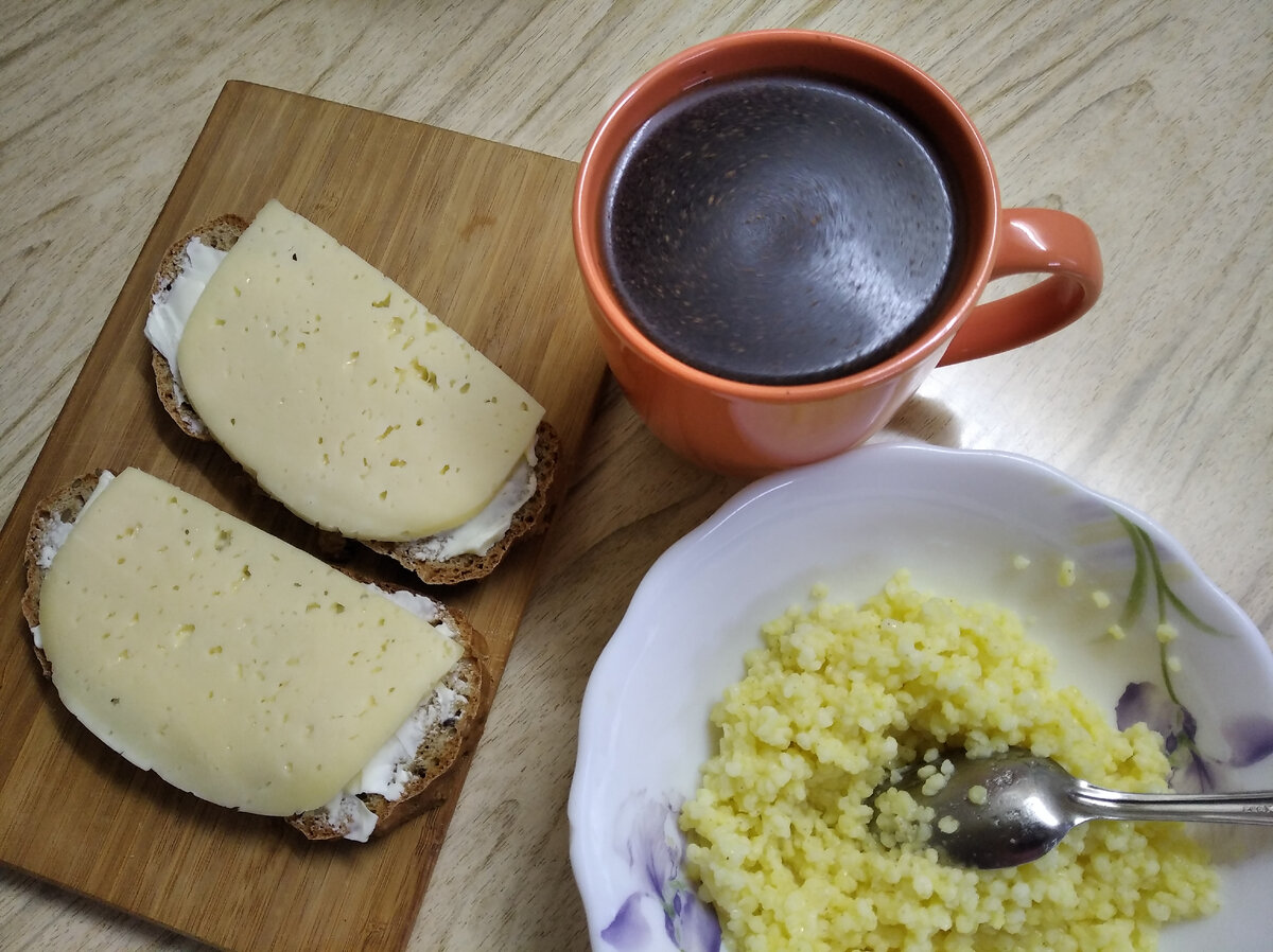 Небольшой отчет по меню: Как видите, еда вся довольно простая. Вечер у меня был посвящен приготовлению пищи. Сначала поставила в духовку хлеб. Хлеб я пеку из цельнозерновой муки на кефире. Его обычно хватает на 2-3 дня. Раз уж завела духовку, а в холодильнике была пачка творога, решила еще и кекс испечь. Тоже из цельнозерновой муки. К кексу намешала меда с корицей. Эту полезную смесь очень вкусно намазывать на кекс. Муку белую в этом рецепте я заменяю цельнозерновой, а маргарин - подсолнечным маслом. На плите в это время приготовила котлеты из домашнего полуфабриката - они были слегка обжарены и заморожены. Осталось только выложить котлеты на сковородку и потушить их полчаса в воде. Очень просто и удобно! Такие полуфабрикаты начала делать только прошлой осенью, когда у нас появилась вместительная морозилка. Если накрутила много фарша, очень быстро часть котлет обжарить и спрятать в морозилку до лучших времен. Поскольку в последнее время котлеты у нас съедаются очень хорошо, такие полуф