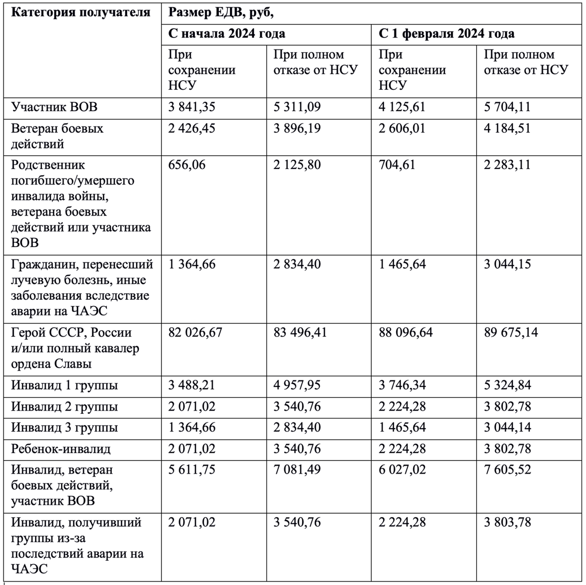 Всех интересует вопрос о том, какая же ежемесячная денежная выплата будет с 1 февраля 2024 года. Для того, чтобы разобраться необходимо обратиться к таблице ниже. В таблице указаны суммы ЕДВ как при сохранении набора социальных услуг (НСУ) так и при полном отказе от НСУ.