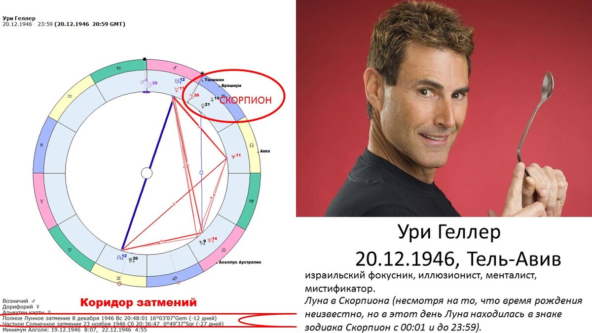 Дополнительно к условиям: ASC в одном из знаков (в раке, или скорпионе, или в рыбах, а также в деве). Планеты управители данных знаков в 1 доме и в аспектах с планетами в 4, 8 или 12 домах, особенно Плутон или Марс в 1 доме. Усиливает сверхъестественные качества рождение человека в период коридора затмений, а также в преддверии или в день солнечного или лунного затмения.