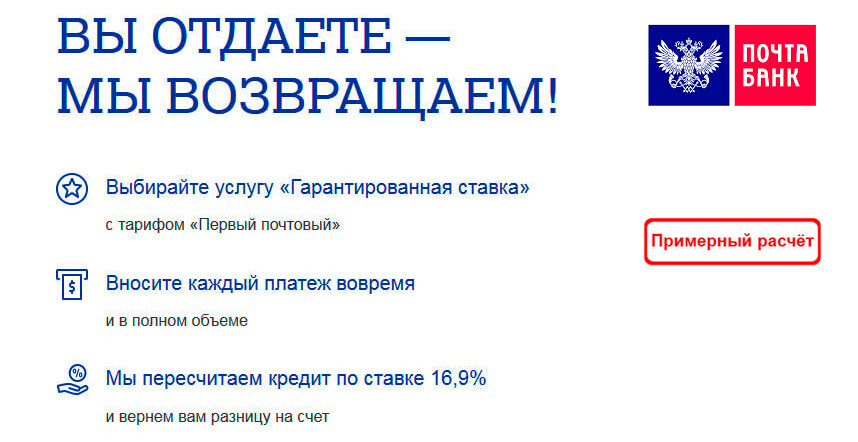Ситуацию мы разберем на реальном примере — на основе отзыва одного из клиентов Почта Банка. В этой организации есть интересный кредит с возвратом части процентов по услуге «Гарантированная ставка». Схема в общих чертах выглядит так. Заемщик платит банку комиссию и подключает услугу по снижению ставки.