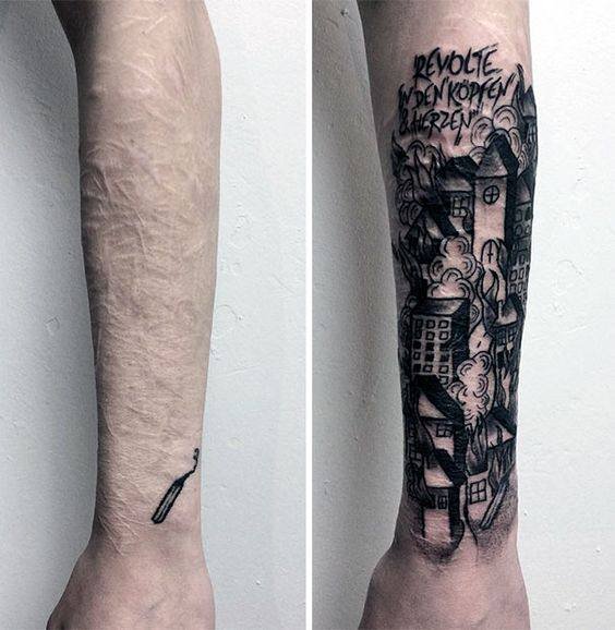 Папилломы и пигментные пятна Делать татуировки на них нельзя. Родимые пятна, родинки и папилломы нельзя травмировать, поэтому чаще всего их просто вписывают в дизайн окружающей их татуировки, но краска на них не наносится. Гипертрофические рубцы Обычно темные, выпуклые, возникающие после сложных операций, серьезных ожогов и обширных травм Келоидные рубцы Механическое повреждение келоидного рубца в ходе нанесения татуировки способно породить новые рубцы. Атрофические шрамы Они возникают из-за глубоких порезов, ожогов, оперативного вмешательства, например, удаление апендицита, кесарево сечение. Этот вид шрамов лучше всего подходит под перекрытие татуировкой.